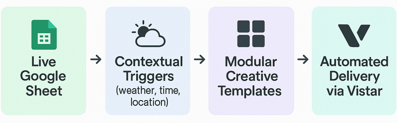 This made it possible to automatically run iced coffee promos on hot afternoons, umbrella ads when it rained, and dinner spots right before 6pm — all without a single manual export.